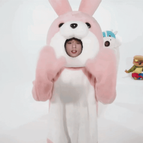 Andteam Harua in a pink bunny costume expresses affection, saying 'LUNÉ, I love you! Boing!' with playful hops.