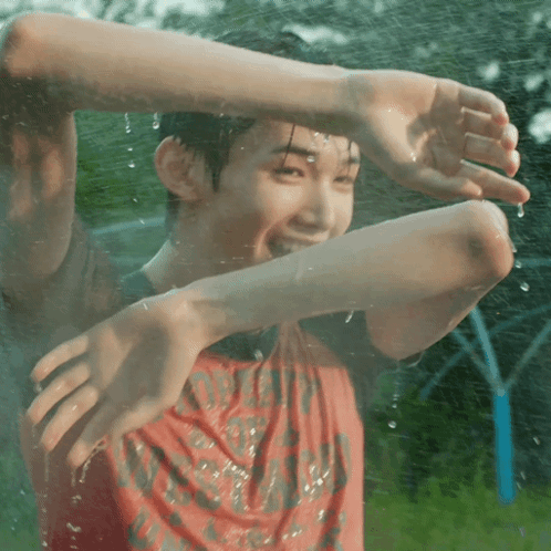 Andteam Jo smiling and playing in the water, his arms raised, wearing a red shirt.