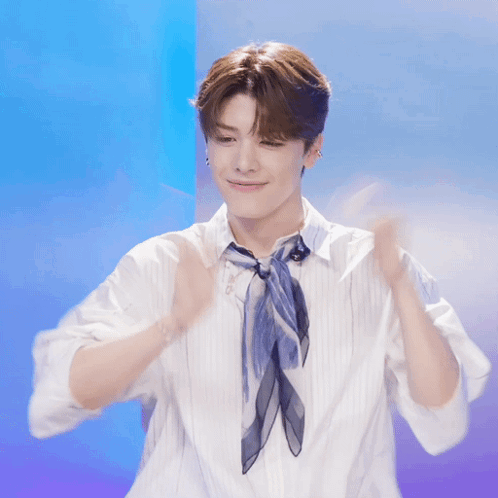 Andteam Maki, wearing a white shirt and blue scarf, smiles and claps enthusiastically.