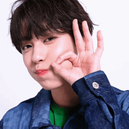 Andteam Taki in a denim jacket and green shirt, making a cute cheek-poking gesture and an OK sign.
