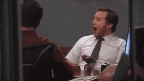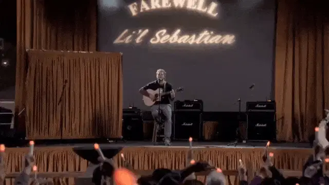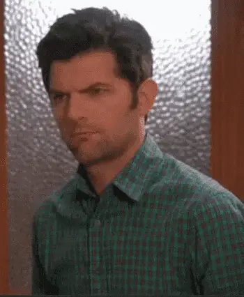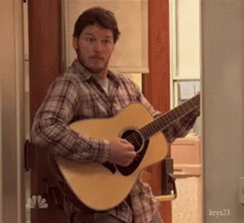 Andy Dwyer from Parks and Recreation plays an acoustic guitar while standing in a doorway.