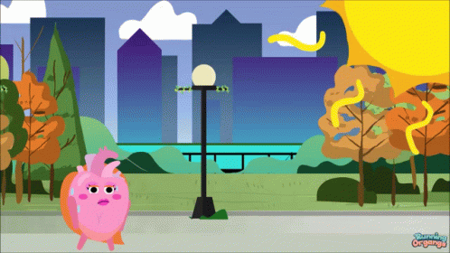 A cartoon heart character sweating profusely and looking overwhelmed by the intense heat in a city park.