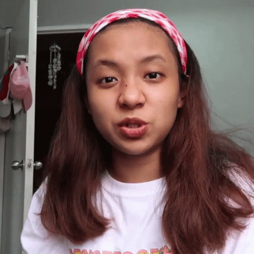 Aliana Villarosa reacts with a pained expression, wearing a plaid headband and white t-shirt.