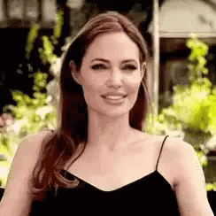 Angelinajolie smiles warmly, posing with her hands in a black spaghetti strap top against a lush green background.