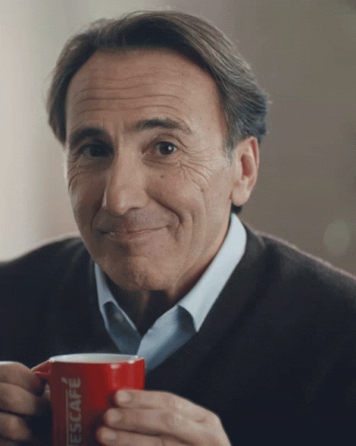 Angelo Bruno smiles while holding a red Nescafe mug, embodying the start of a good day.