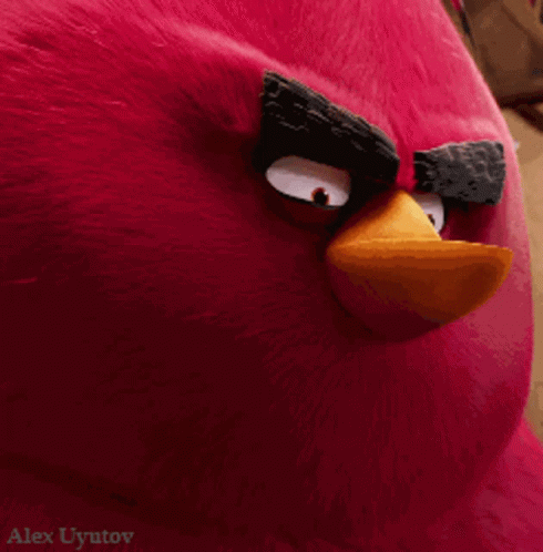 Close-up of an angry red Angry Birds plush toy, featuring the name Alex Uyutov.