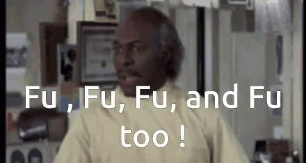 The Angry Hairdresser character delivers the iconic line, 'Fu, Fu, Fu, and Fu too!', with an intense expression.