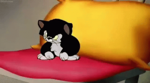 An upset black and white cartoon cat, possibly a character from 'Angry Men Astralis', sits on a red pillow.