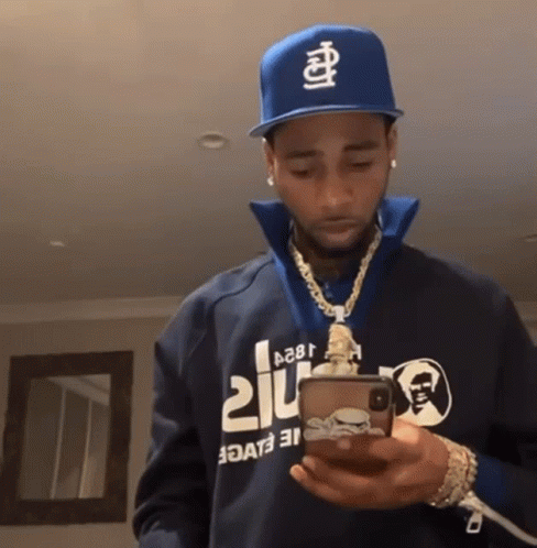 Key Glock, wearing a blue hat and Louis Vuitton jacket, intently looks at his phone, possibly typing.
