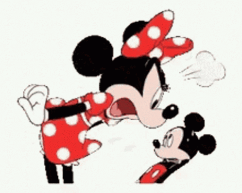 Minnie Mouse furiously yelling at a startled Mickey Mouse, with steam coming from her nose in a classic cartoon moment.