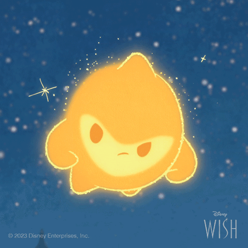 The glowing, orange Star character from Disney's Wish looks angry, floating in a starry night sky.