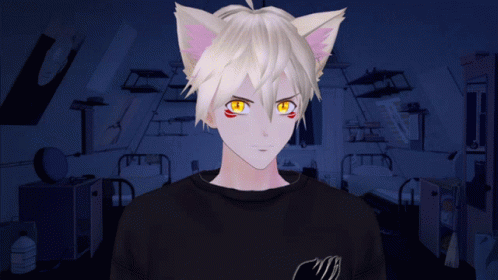 An anime boy VTuber with white hair, cat ears, and yellow eyes, vibing with an angry expression.