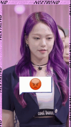 Yue from Lapillus shows an angry expression with her vibrant purple hair and 'cool bunn' shirt.