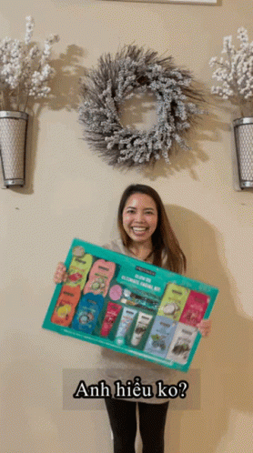 A smiling woman holds a box of beauty products, asking 'Anh Hieu ko?' (Do you understand?).