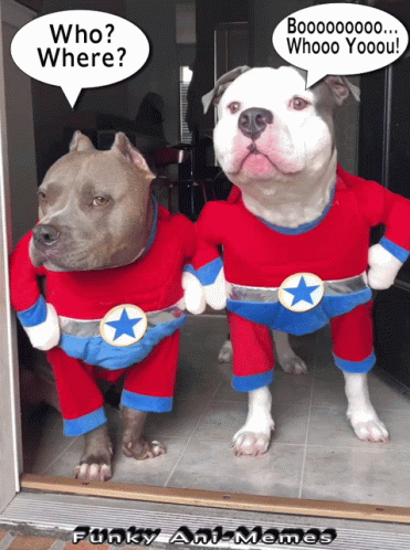 Two adorable Pitbulls in superhero costumes bark and question 'Who? Where?' and 'Booooooooo... Whooo Yoou!' in a funny Ani Memes clip.