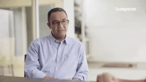 Anies Baswedan, wearing a blue shirt and glasses, sits at a table talking in Jakarta.