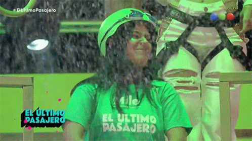 Mile, animated and celebrating, gets wet on 'El Ultimo Pasajero' set, wearing a green shirt and helmet.