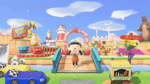 A cheerful Animal Crossing character explores a beautifully decorated island with cherry blossoms and attractions.