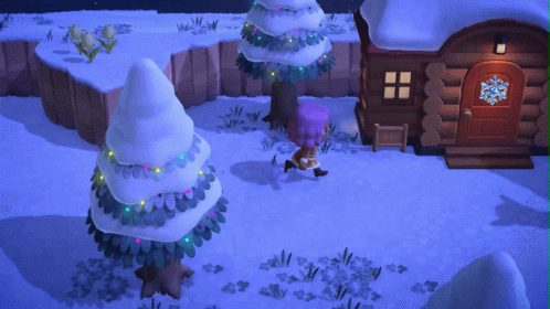 A character walks through a festive, snowy Animal Crossing New Horizons village at night with decorated trees and a campfire.