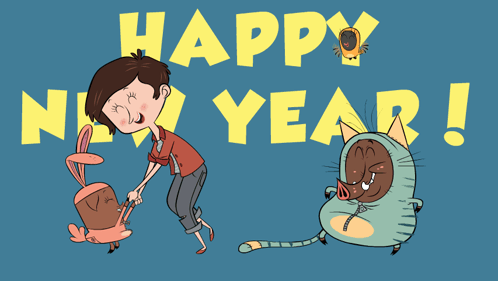 A boy and his animal friends, including Sam, Suzie, Zipzip, and Eugenie, celebrate a Happy New Year.