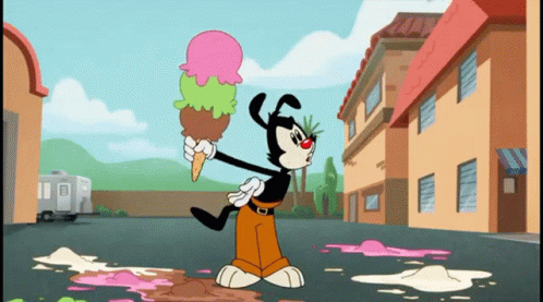 Yakko Warner holds a large ice cream cone, only for Pepe Le Pew to drop in and steal a lick from it.