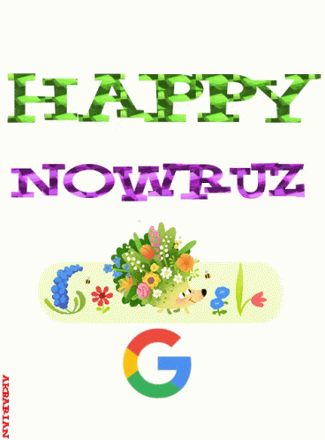 An animated greeting card wishing 'Happy Nowruz', featuring a Google Doodle with a hedgehog, flowers, and the Google logo.