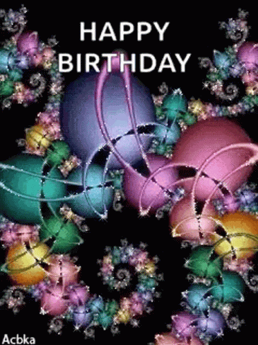A sparkling animated 'Happy Birthday' message with glitter, balloons, and flowers.