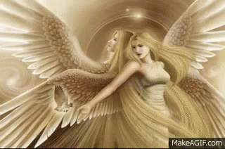 Animated sequence featuring angelic figures, a kaleidoscopic mandala, and a man with a parrot wing, conveying a spiritual message.