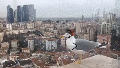 A funny seagull with drawn-on anime glasses and a red hat stands on a rooftop, surveying a city.
