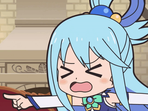 Aqua, the anime goddess from Konosuba, looks annoyed and points her finger in a chibi style.