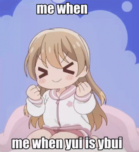 An excited anime girl, Yui, raises her fist in a meme about being happy.