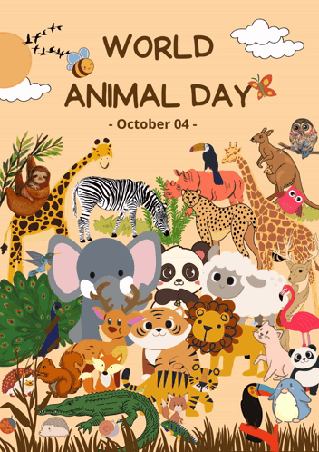 A vibrant animated poster celebrating World Animal Day on October 4th, featuring a diverse collection of cute cartoon animals.