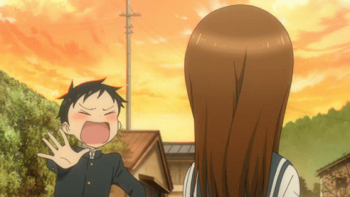 Takagi-san playfully rejects a boy's request with a 'no' gesture and a mischievous expression in this anime scene.