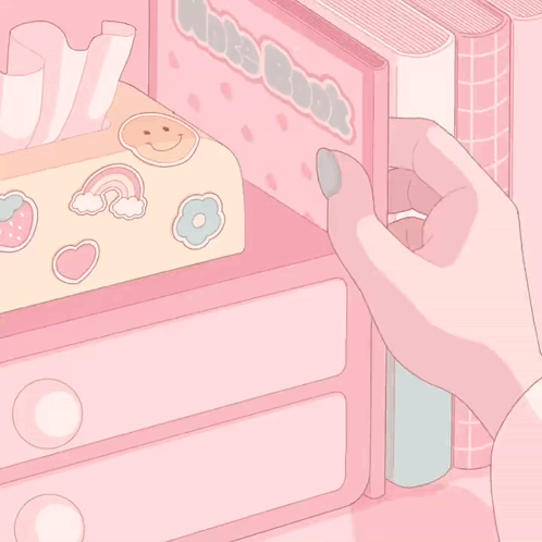 Animated hands writing, decorating a notebook with stickers, and erasing in a cute pastel pink aesthetic.