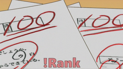 Anime scene featuring test papers with perfect 100 scores, a boy showing a paper to a girl, and the text '!Rank'.