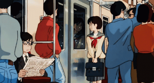 An anime scene shows people commuting on a crowded subway train, including a schoolgirl and a man reading a newspaper.