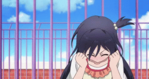 Anime character Umi Sonoda transitions from shyness to pure joy, raising her arms in a happy celebration.