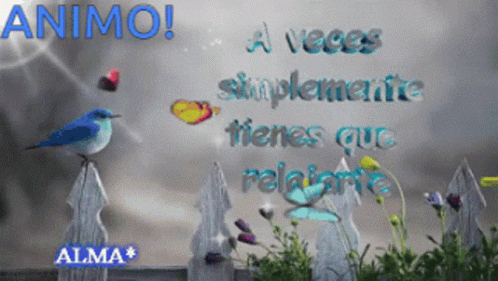 A blue bird on a fence with animated butterflies and flowers, displaying an encouraging Spanish message about relaxing and having confidence.