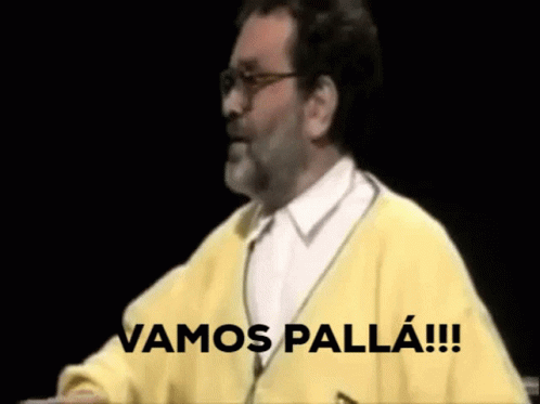 A man in a yellow sweater energetically exclaims 'Vamos Pallá!' and 'Hostias Ya!' with passion.
