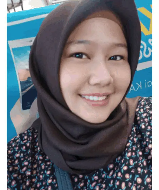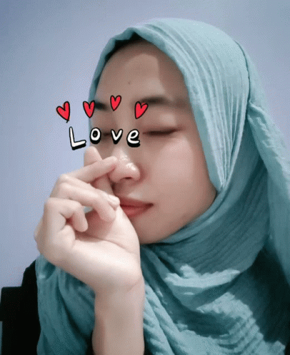 Anis wearing a blue hijab, making a finger heart gesture, with a 'Love' overlay on her face.