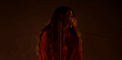 Anitta performing live, wearing a red outfit in a dark, dramatic setting.