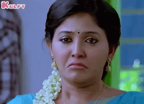 Anjali in a blue sari, showing a bhibatsam expression, appearing distressed or on the verge of tears.