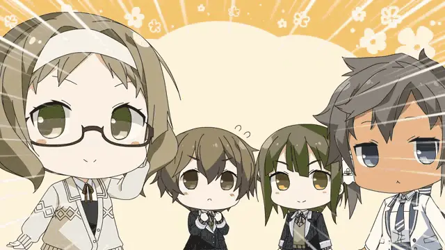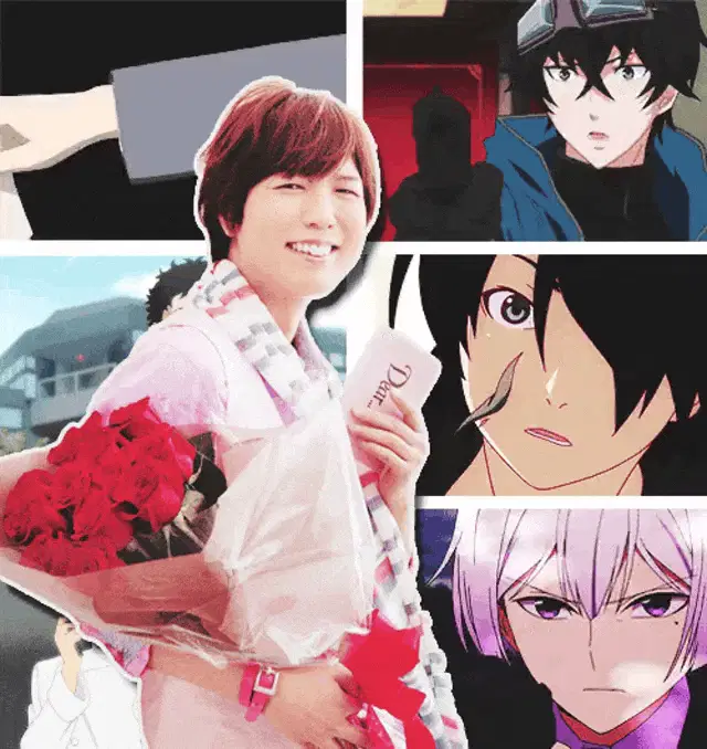 Natsume Sakasaki from Ensemble Stars poses with the 'Anjing Lo' text overlay in a vibrant stage performance.