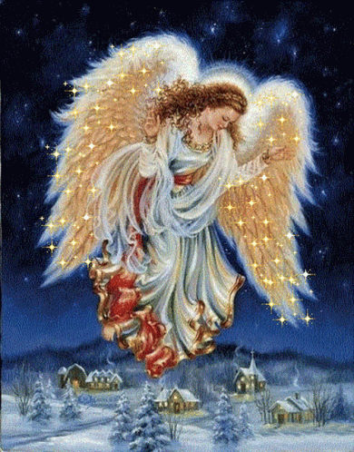 An angel with golden, sparkling wings hovers gracefully over a peaceful, snow-covered winter village scene.