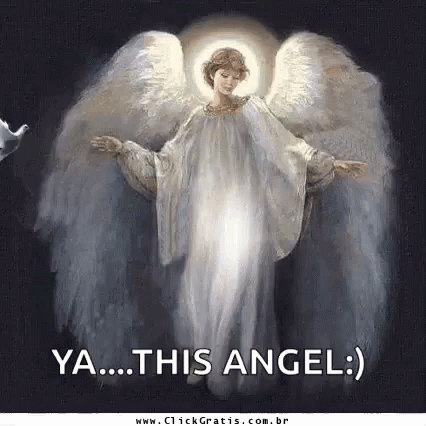 An angelic figure with large white wings and a radiant glow, featuring the text 'YA....THIS ANGEL:)' at the bottom.