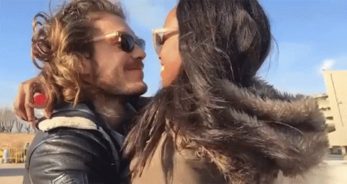 Anna Barreto shares a passionate kiss with a man outdoors under a clear blue sky.
