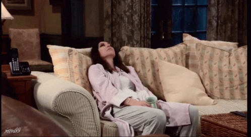 Anna Devane, portrayed by Finola Hughes, relaxes on a couch, holding a cup.