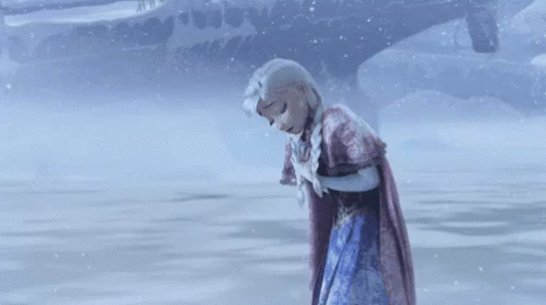 Anna shivering in the snow, feeling very cold, with the Indonesian caption 'DINGIN BANGET!!' (So cold!!).