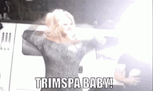 Anna Nicole Smith enthusiastically promotes Trimspa, standing with arms outstretched in front of a white van.
