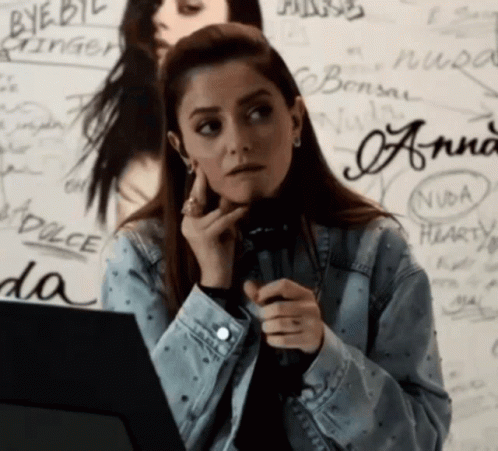 Annalisa Nali looking pensive while holding a microphone, wearing a denim jacket.